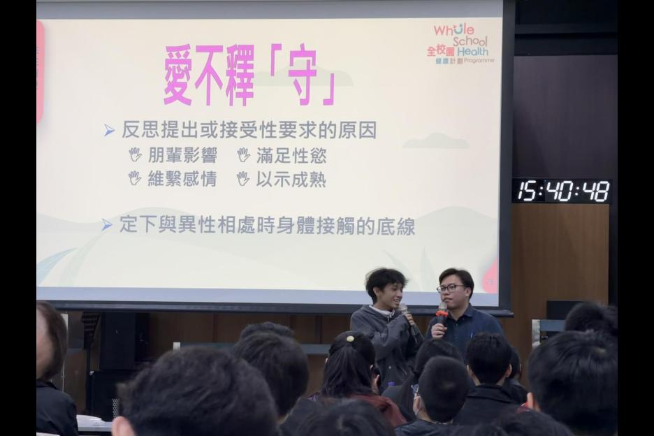 輔導組為中二及中三級學生舉行「性」在有愛講座,透過講解性與愛的關係,引導學生認識愛情中的親密、承諾與責任,學習以適當方式處理性衝動,尊重自己及他人,並建立正確而負責任的價值觀。