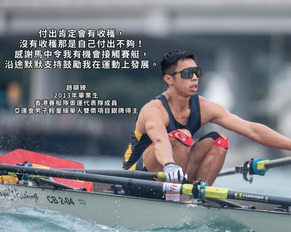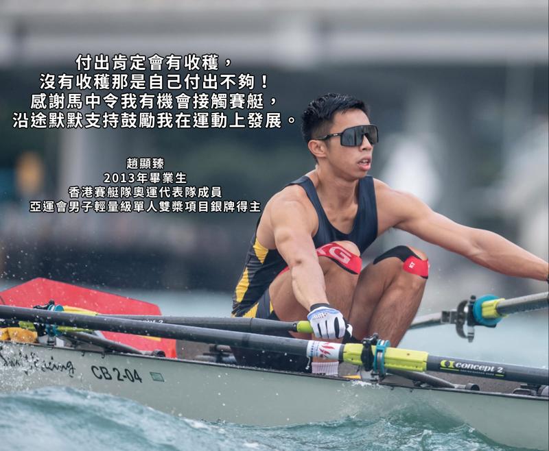 我亦不時被邀請回到母校與老師、師弟師妹及家長分享,讓大家認識及了解我的運動人生。我心中回想,馬中的老師們確實是因材施教,他們了解我對運動的熱愛,並看到我在運動場上的潛質,因此鼓勵我去接觸賽艇運動,從而開啟了我在划艇運動的光輝人生。