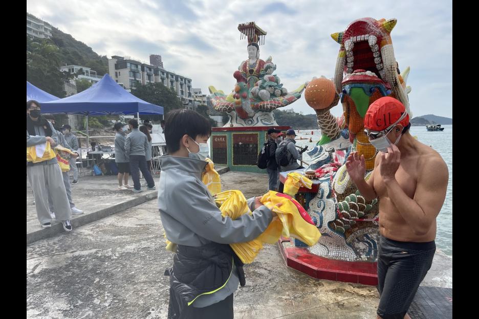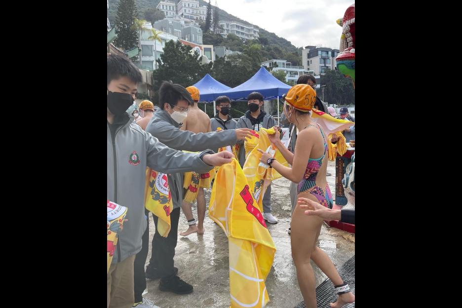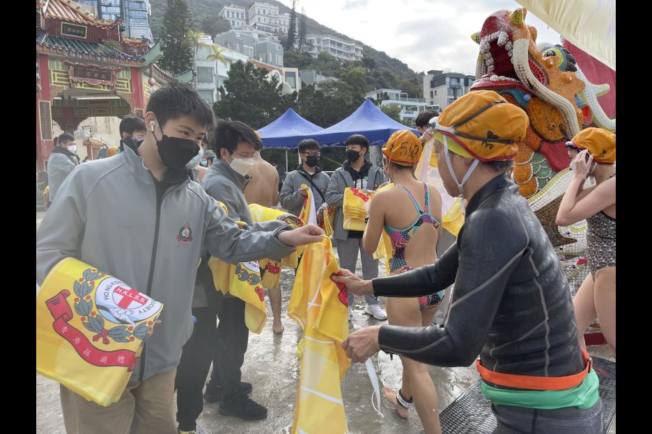 本校紅十字會同學在元旦日的早上,一同參與一年一度盛事- - -元旦冬泳錦標賽,擔任工作人員,負責為參賽者派送紀念毛巾,在寒冷的天氣送上一點溫暖,本校同學熱心服務,獲賽事中的總裁判讚賞。