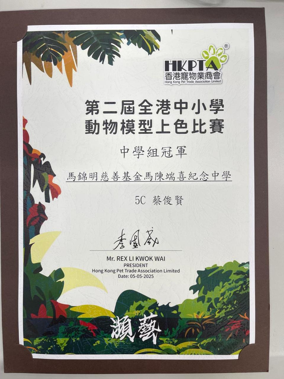 高中視覺藝術科學生5C蔡俊賢參加全港中小學瀕危物種模型上色比賽2025榮獲冠軍。